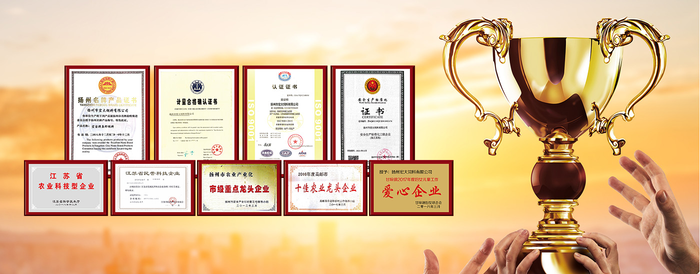 先后榮獲江蘇省飼料質(zhì)量合格產(chǎn)品、江蘇省名牌產(chǎn)品、揚(yáng)州市消費(fèi)者滿意商品、揚(yáng)州市質(zhì)量計(jì)量信得過產(chǎn)品等稱號(hào)。